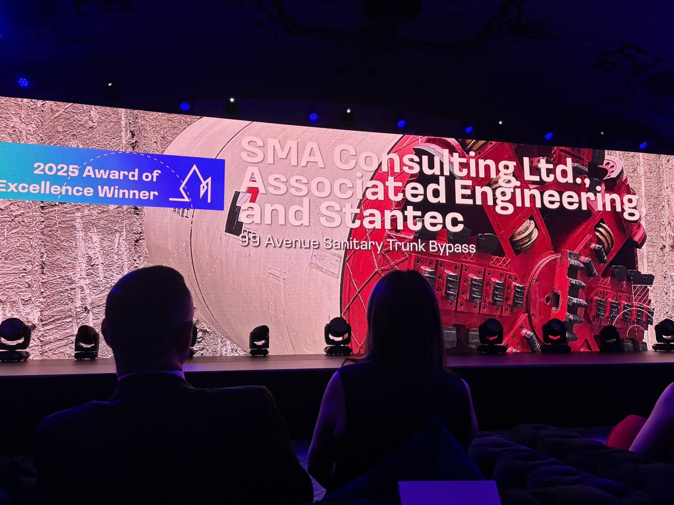 In October, members of SMA Consulting Ltd.’s team were thrilled to travel to Ottawa with our client to receive an ACEC (Association of Consulting Engineering Companies – Canada) National Award of Excellence for their work on the 99 Avenue Sanitary Trunk Bypass project. This project was initiated by the owner, EPCOR, and involved the construction of a new 1.6-km bypass sewer to allow for rehabilitation and increase capacity. Innovative microtunnelling minimized surface impact and the first use of specialized pre-lined concrete pipe in Edmonton withstood large boulders and jacking forces of up to 1000 tonnes. The final connection to the trunk was made under live flow conditions during the dead of night.